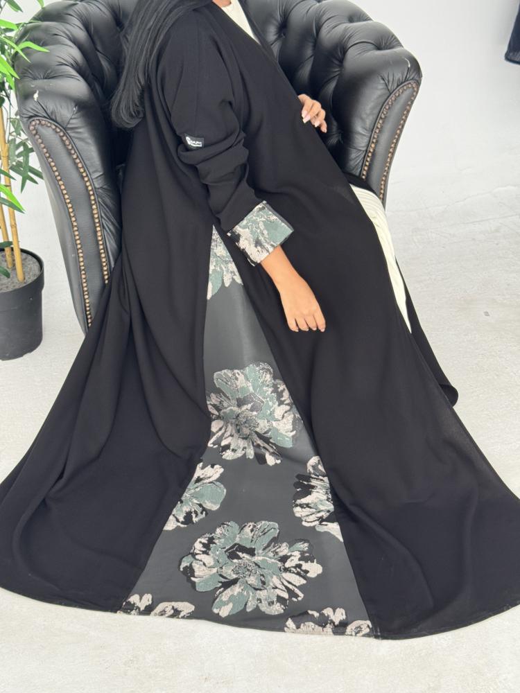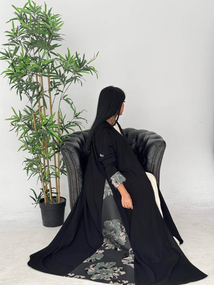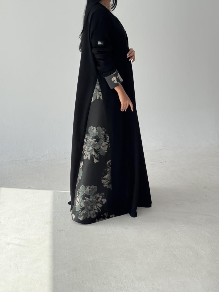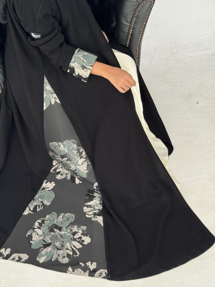 - الإضافة: تدخيلات قماش جاكار مطرز بالورد على أطراف اليدين والجوانب.