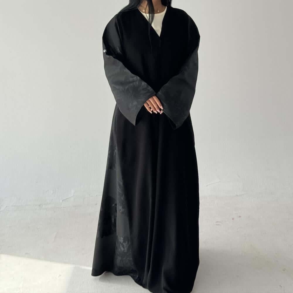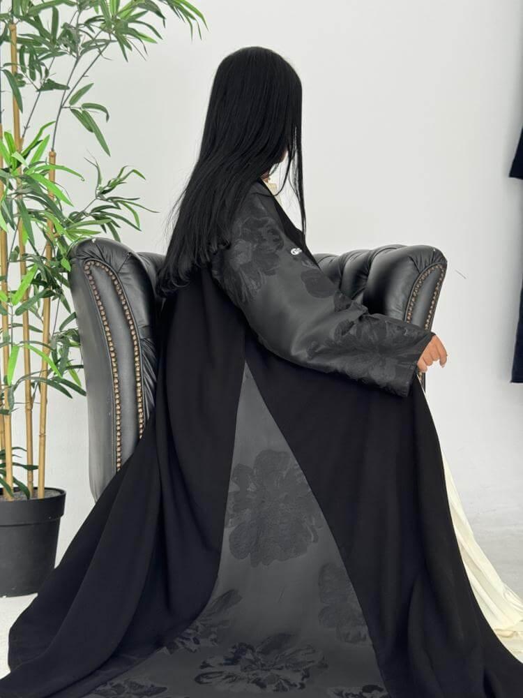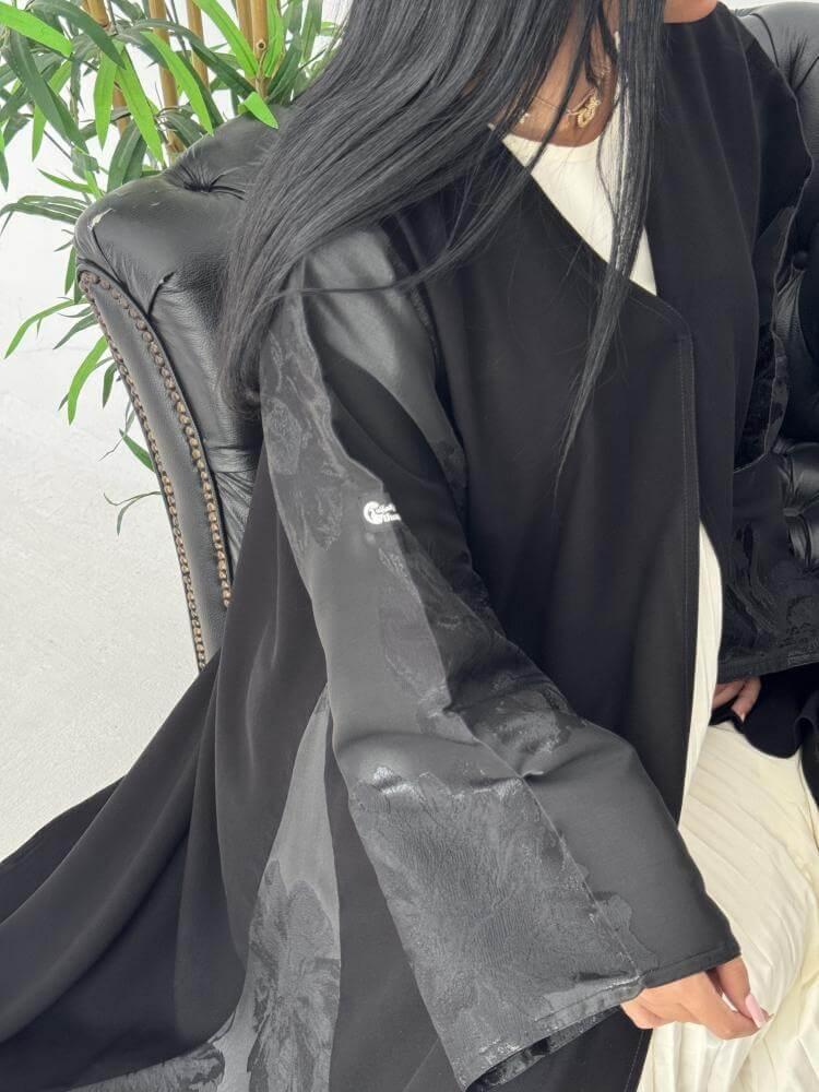 - الإضافة: تدخيلات قماش جاكار مطرز بالورد على اليدين والجوانب.
