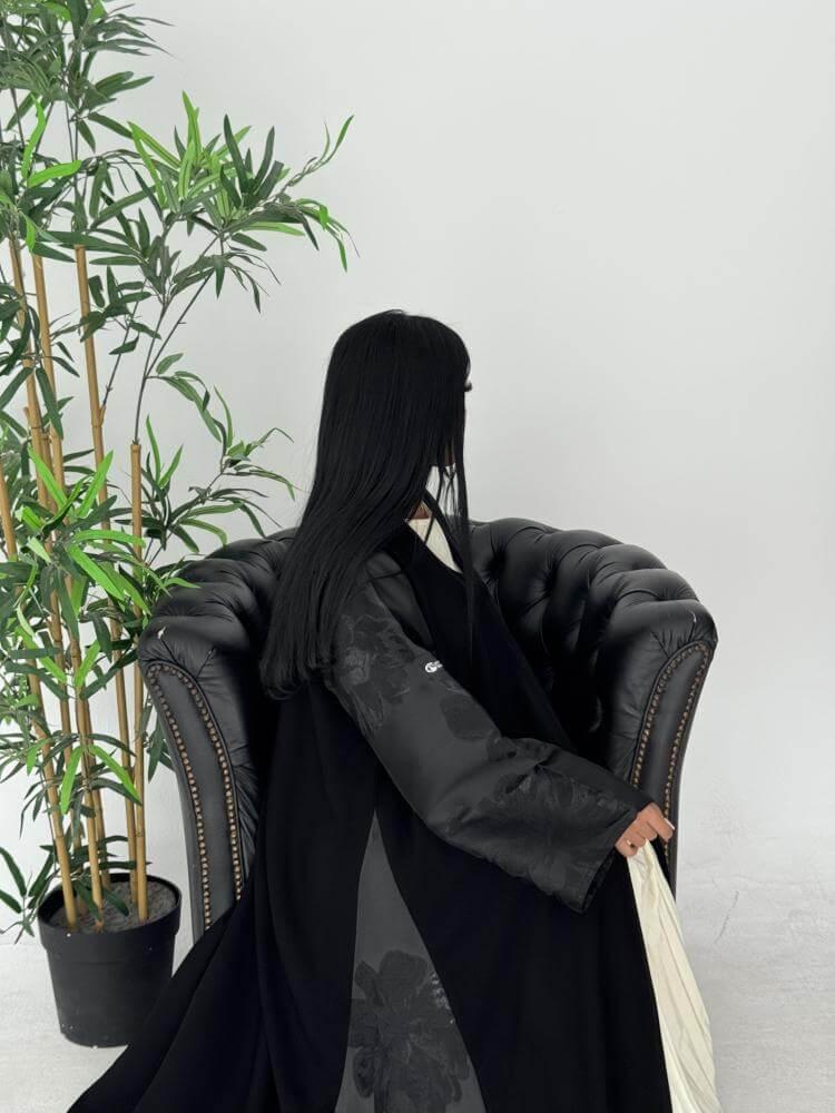 تصميم كلوش بخامة الكريب الملكي الكوري الفاخرة، تتزين بلمسات الجاكار المطرز بورود ملونة، إطلالة أنثوية فاخرة تلفت الأنظار.
