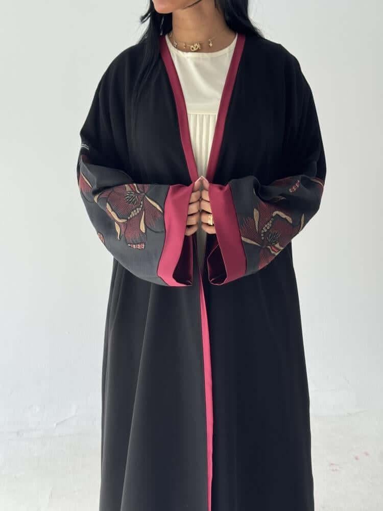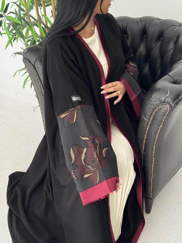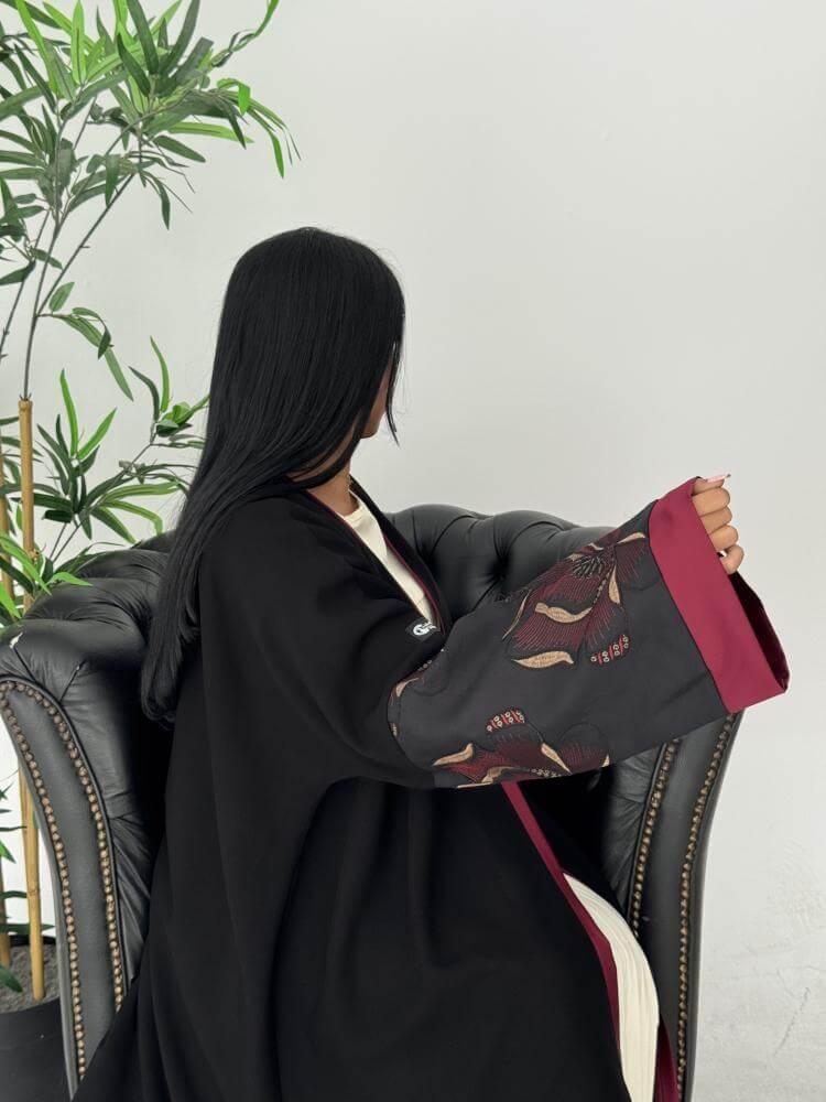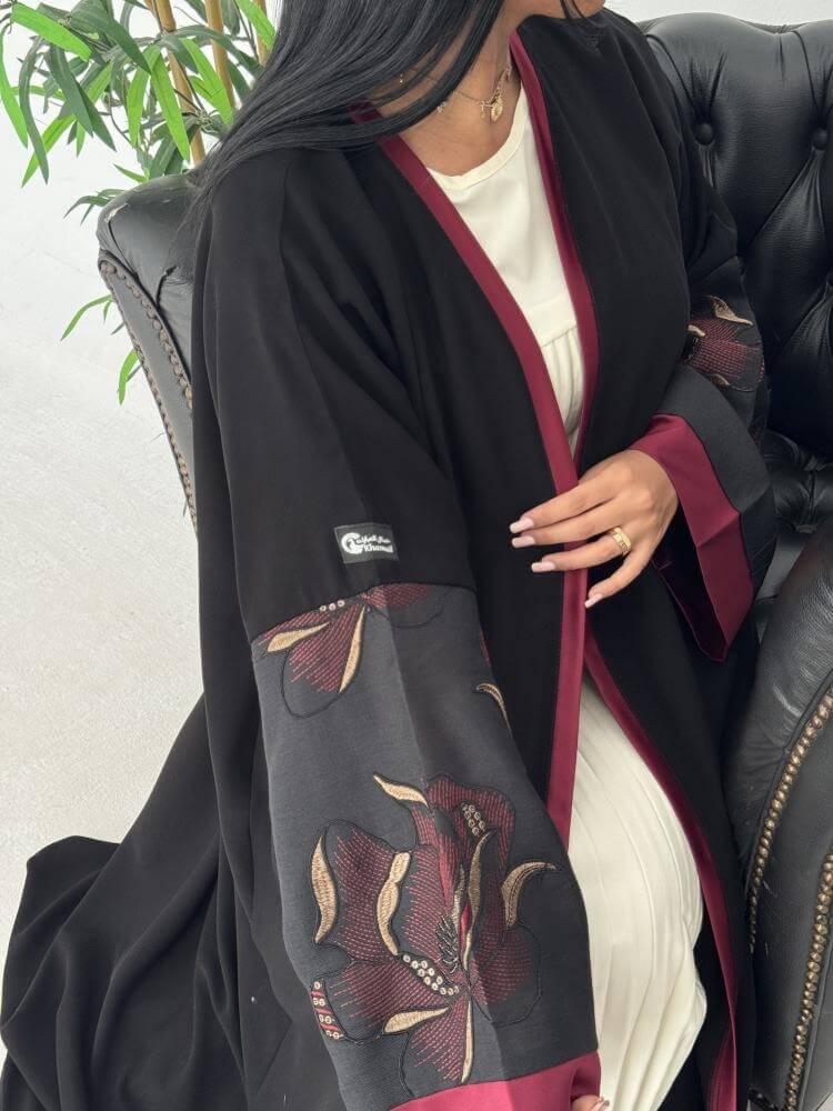 - الإضافات: براويز أمامية كاملة بلون عنابي وتفاصيل فاخرة على أطراف الأكمام.